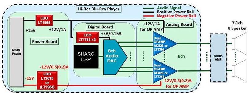 ADI 公司拥有一些瞬态响应性能出色的 LDO,最适合高分辨率和高质量产品。例如,正线性稳压器 LT1763、LT1965 和负线性稳压器 LT1964、LT3015 有助于改善电压调节性能,消除负载瞬态电压尖峰,从而提供更好的音频性能。