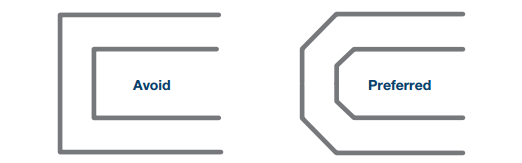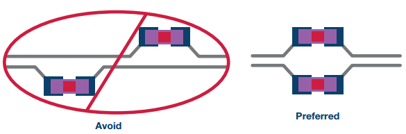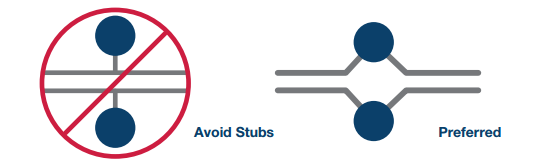 如果一对中的相邻线路之间的距离大于电介质厚度的2倍,则其间的耦合会很小。此规则也是基于差分信号相等但相反这一事实,如果外部噪声同等地干扰两个信号,则其影响会互相抵消。同样,如果走线并排布线,则差分信号在相邻导线中引起的任何干扰噪声都会被抵消。