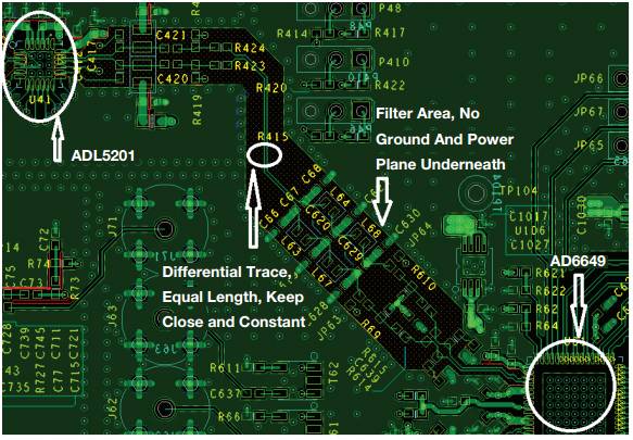 ADI接收器参考设计板(参见图5)提供了差分滤波器PCB布局的一个示例。这显示了ADL5201和AD6649之间有一个五阶滤波器。AD6649是一款14位250 MHz流水线式ADC,具有非常好的SNR性能。